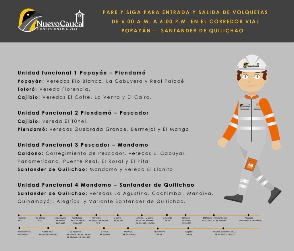 De esta manera, el Concesionario Nuevo Cauca tiene a su cargo la rehabilitación y mejoramiento de la calzada existente, y la construcción de la segunda calzada entre Popayán y Santander de Quilichao.