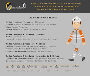 (10/11/25) Desde las 6:00 a.m. hasta las 6:00 p.m. se realizan actividades en la vía donde encontrarán Pasos controlados a un carril con Pare y Siga solo para entrada y salida de volquetas, los tramos son: